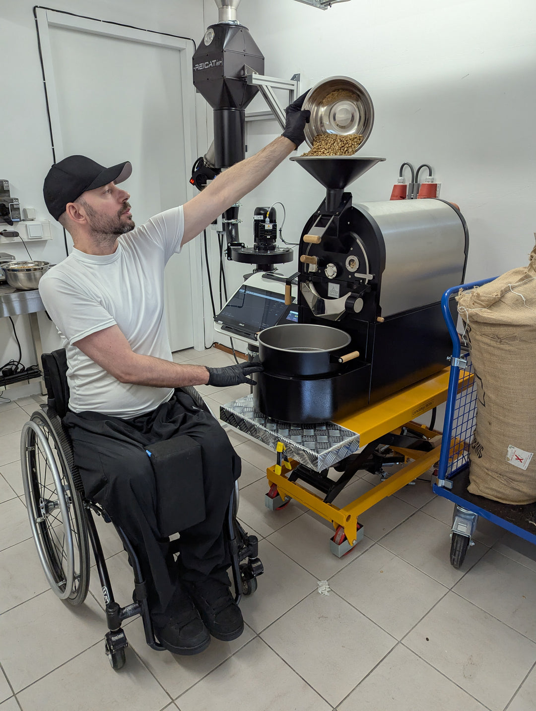 Roy hier! Dol op koffie, minder dol op traplopen. Ik zit in een rolstoel, maar gelukkig heb ik mijn draai gevonden in het branden van bonen, iets wat ik ondanks wat fysieke beperkingen nog steeds zelf kan. Ik ben bezig om van mijn hobby mijn werk te maken, omdat ik zo dol ben op koffie. In mijn eigen werkplaats brand ik elke batch met zorg, aandacht en smaak. Want goede koffie branden kan ook prima zittend.